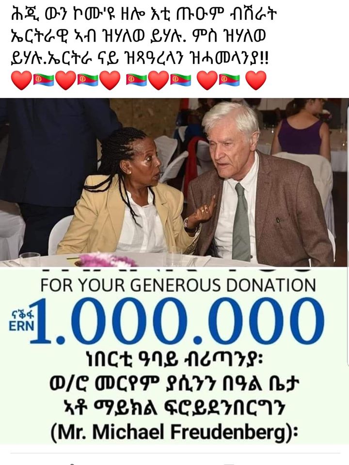 Ms. Meriam Yasin with her husband Mr. Michael Freudenberg contributed 1 million Nakfa