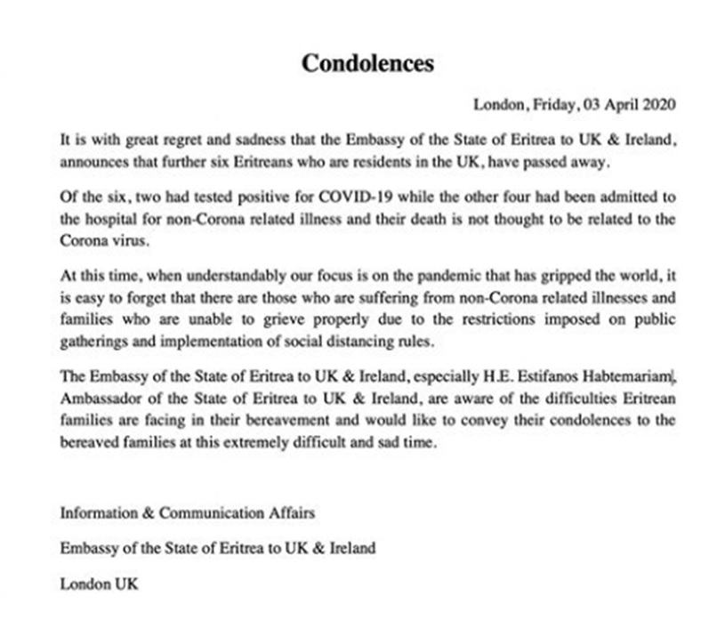 It is with great regret and sadness that the Eritrean Embassy in London, announces that a further six Eritreans who were residents in the UK, have passed away,